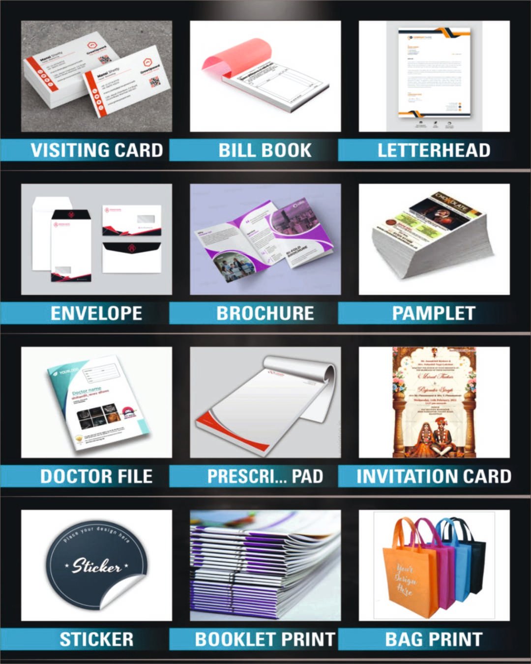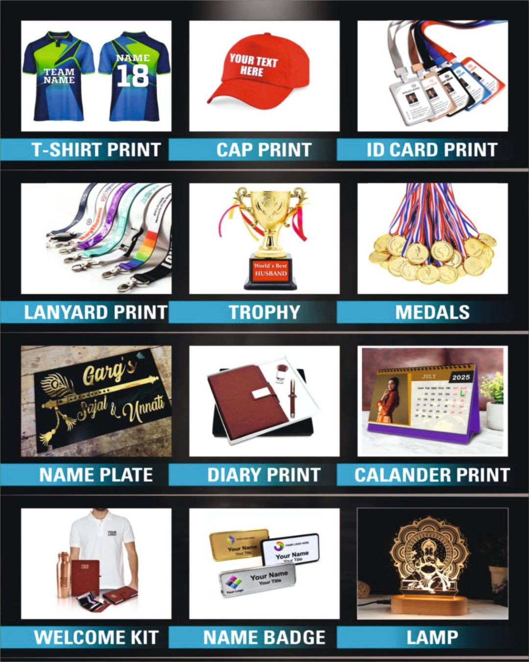 "Corporate mug print Corporate T _ shirt Printing Corporate joining kit Welcome kit printing Flex banner Priting LED / Sing board Printing Visiting card Printing Letter head Printing Envelope Printing Sticker printing" FLAX Banner, LED Board, Acrilic Board, Sign Board, Sticker, Foam Sheet, Visiting Card, kankotri, Corporate Gift, Engraving, UV Printing, T Shirts Printing, Cap Printing, Kurta Printing, Pen Printing *We Print Everything except Currency*